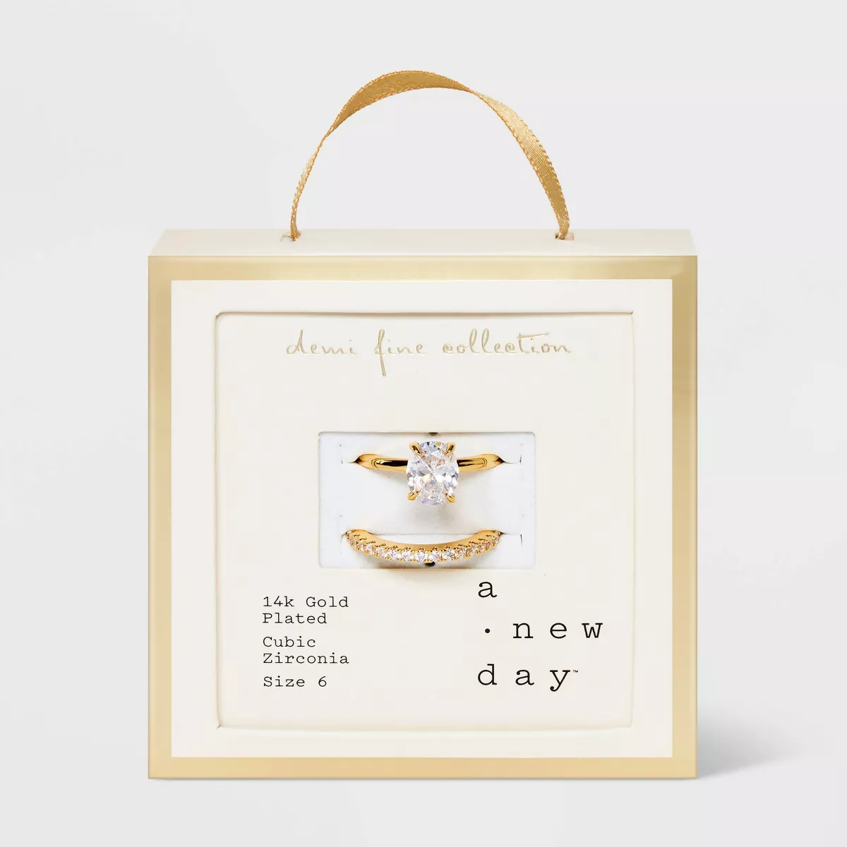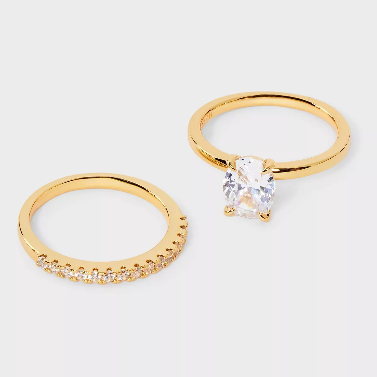 Flaunt your couple goals with the 14K Gold-Plated Oval Cubic Zirconia and Pave Band Wedding Ring Set from A New Dayâ„¢. This two-piece wedding ring set includes cubic zirconia accented oval and pave rings for a great coordinating set. Made with nickel-free metal, this gold-plated ring set helps create a beautiful look on any finger. Plus, it comes in a box with handle for convenient gifting and creating an amazing Suprise for a loved one.