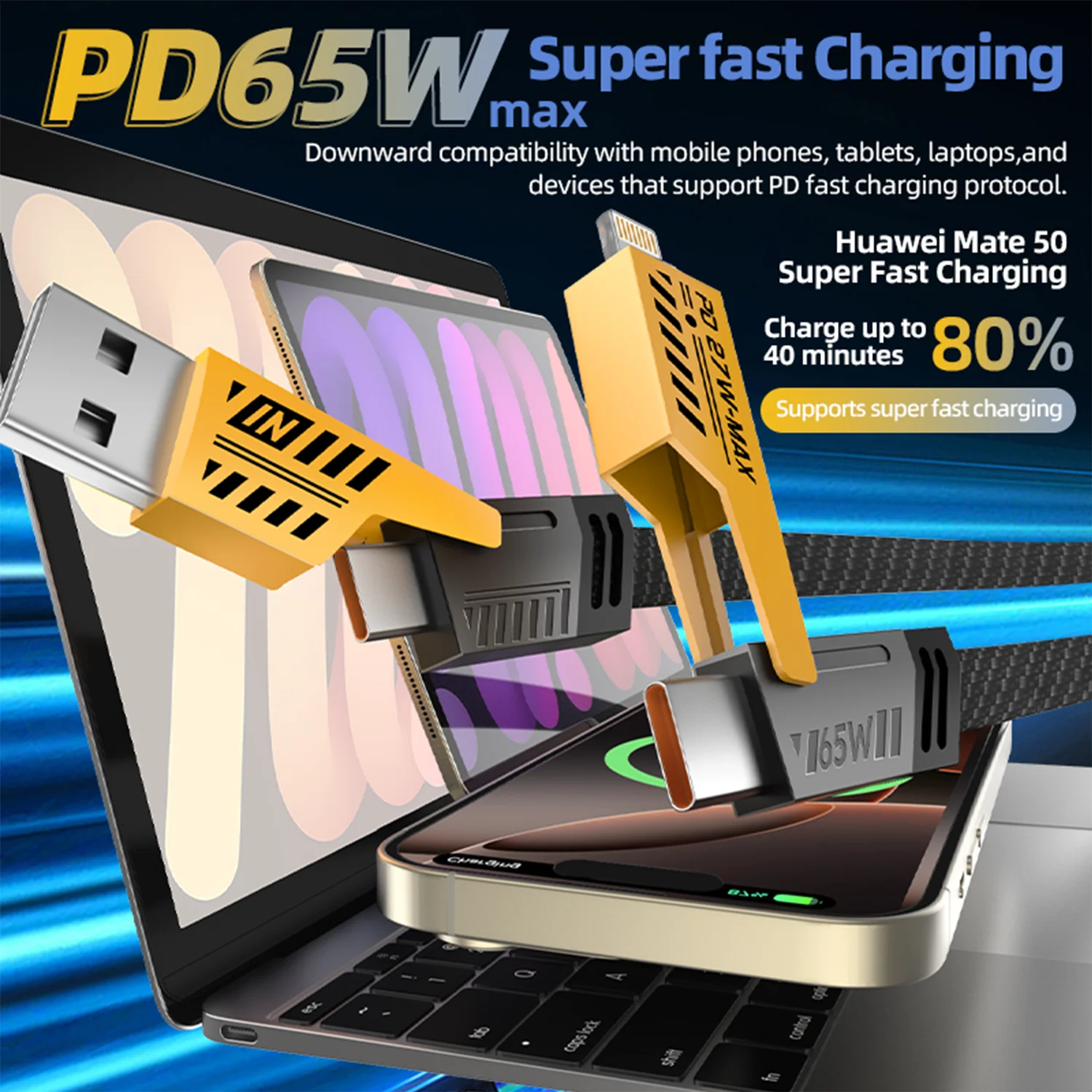 Firsting 2PCS 65W 4-in-1 Fast Charge Multi Cell Phone Data Cable 27WPD Charge Cord Charging cable.This fast charging cable focuses on the designer’s latest design ideas, using a 4-in-1 interface design, different interfaces can be converted between each other, one cable can meet the charging needs of various devices. It uses high-quality copper wire, the maximum current transfer can reach 65W, transfer files up to 480Mbps, file wonderful transfer without waiting. The outer cord is made of double-layer nylon braid with TPE insulation, which is tough and durable, and the length of 4 feet can meet the needs of different places. It is available in black and orange colors to meet different aesthetic needs. If you have any questions, feel free to contact us and we will help you.